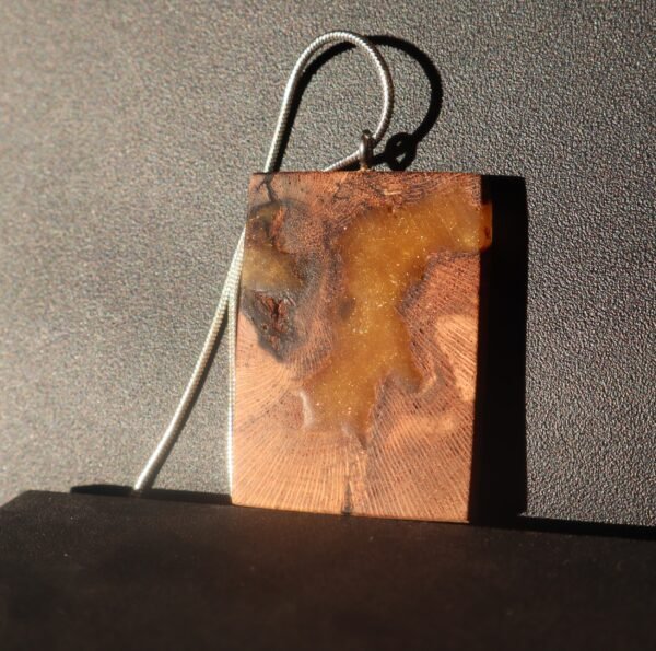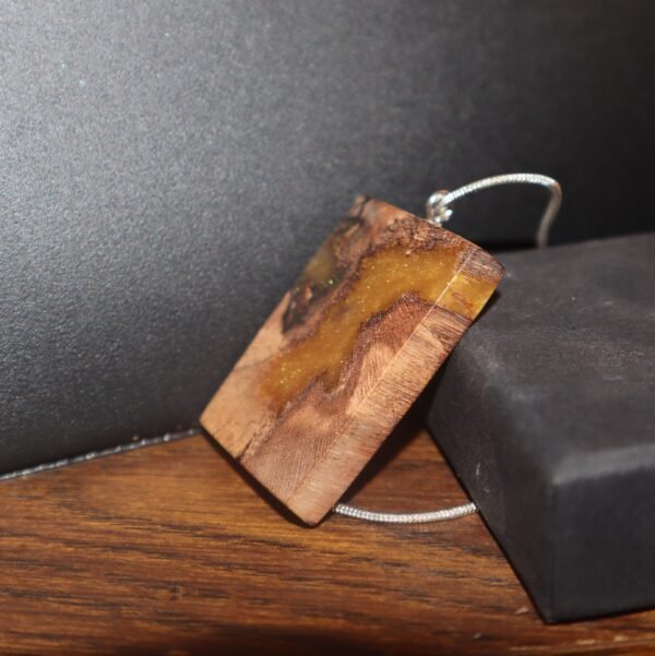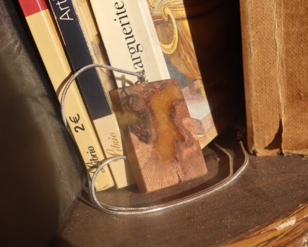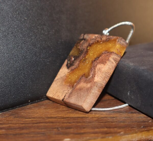 Joli petit collier de forme carrée “Fleuve d’Or”, accompagné de sa chaîne en argent plaqué. Créé à partir de bois de vignes et de résine colorée en couleur or pour sublimer votre look !