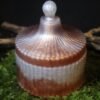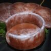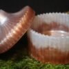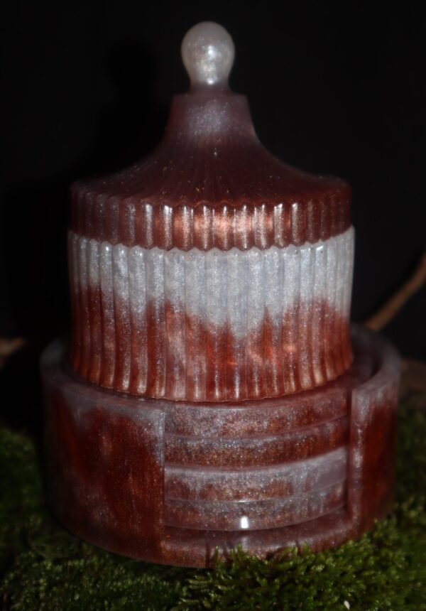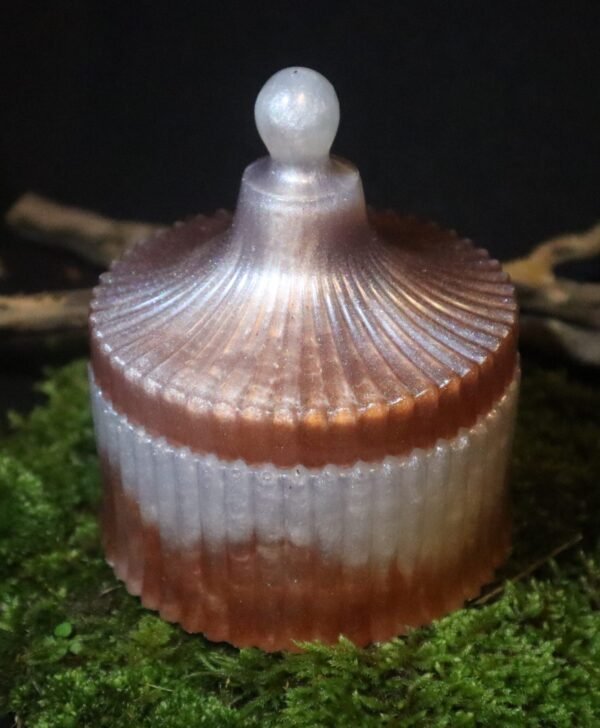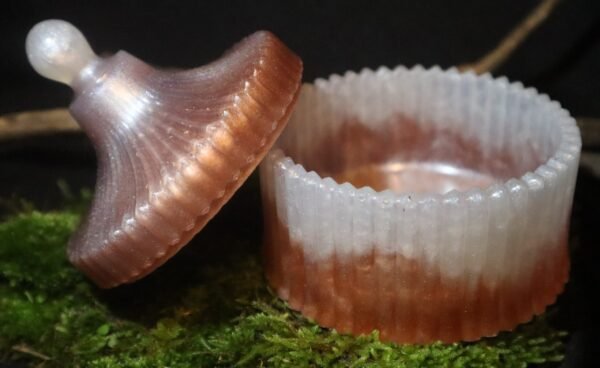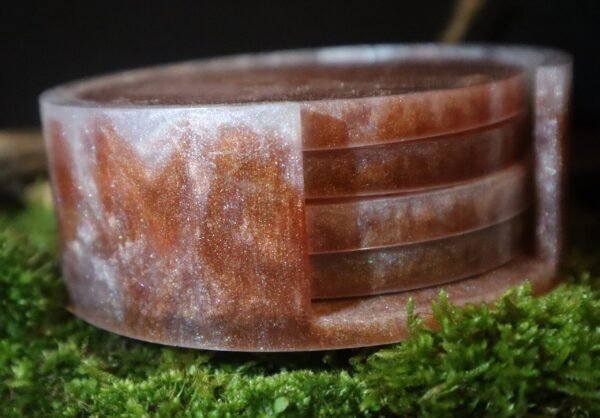 Joli petit ensemble d’une petite boîte et dessous de verre en résine, dans des tons vieux rose et blanc.